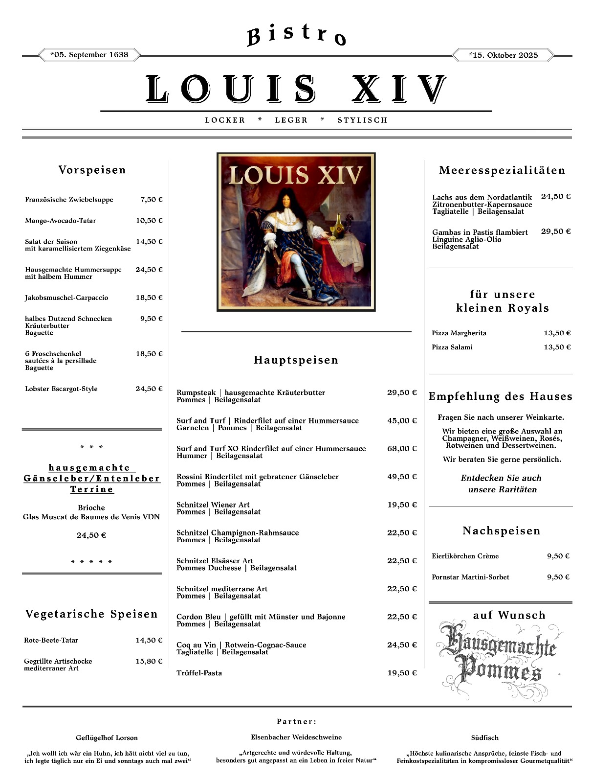 Ein herzliches Willkommen erwartet Sie im Louis XIV . Wir freuen uns, Ihr Gastgeber in Saarlouis zu sein! Kommen Sie vorbei und lassen Sie es sich in unserem Bistro gut gehen. Wir freuen uns auf Sie! Wir begrüßen Sie mit echter Gastfreundschaft und einer großartigen Auswahl an französischer und deutscher Küche. Unser freundliches Personal serviert Ihnen die besten Gerichte. Unsere köstlichen Speisen warten darauf, von Ihnen probiert zu werden.  Genießen Sie zu Ihrem Essen ausgezeichnete und exklusive Weine, tolle Aperitif und Degestif, ausgezeichnete Biere und eine Auswahl an geschmackvollen Biotee Sorten sowie weiterer Getränke in unserem gemütlichen Ambiente. Lehnen Sie sich zurück, entspannen Sie sich und genießen Sie Mittag- und Abendessen in unserem exquisiten Lokal.